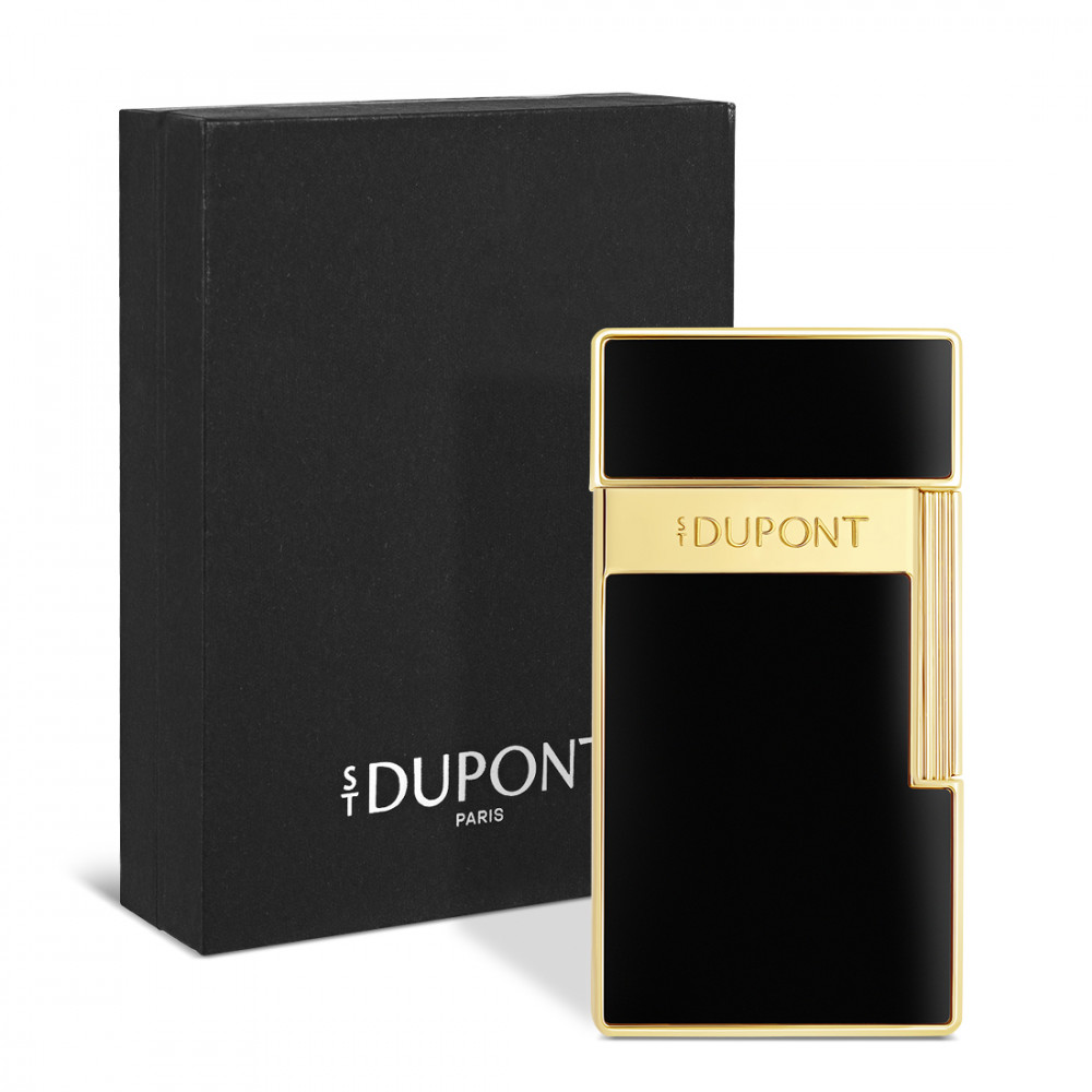 Das Feuerzeug S.T. Dupont Biggy in Schwarz und Gold sticht als Meisterwerk hervor und vereint die zeitlose Eleganz von Schwarz mit dem prunkvollen Glanz von Gold.