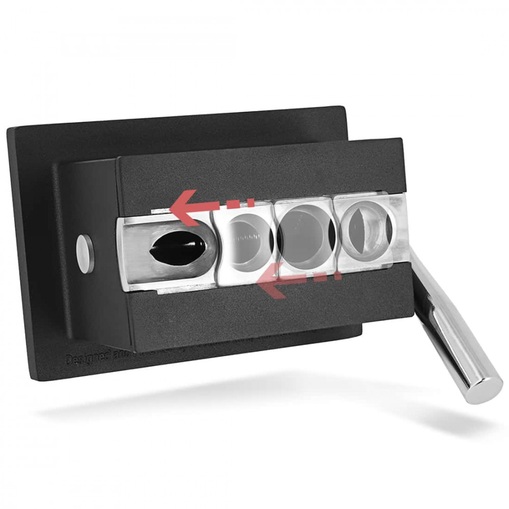 Imposing cigar cutter of table in black and chromed metal. It allows to realize not less than four different cuts on its module. There is for example a classic cut, a bevel cut. The plates on top of the holes are sliding, allowing to secure the other cuts when the lever is operated.