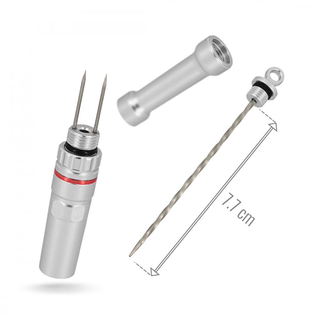 Thanks to its ability to perforate the end of the cigar with choice precision, you can create a 0.8 or 1.2 cm diameter orifice to suit your taste, simply by adjusting the direction of rotation to activate the desired puncher. Beyond this main function, unscrewing the device reveals a twisted steel rod, designed to be inserted into the cigar. By turning and gently extracting, this rod facilitates the removal of excess tobacco, thus optimizing the draw. What's more, the two small integrated rods hold and enjoy your cigar right to the end, guaranteeing a flawless experience. Offered in a silver finish, this perforator is also available in black on our site, combining functionality and elegance.