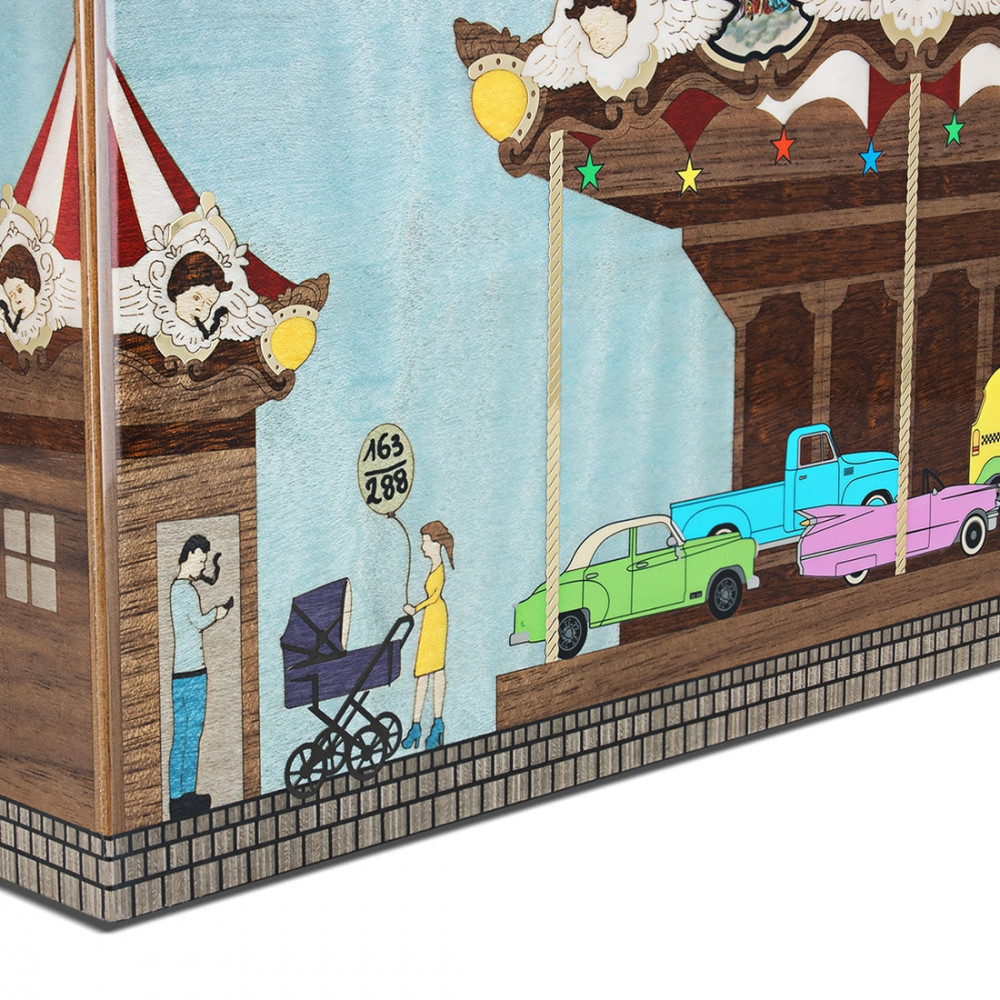 The Elie Bleu Carrousel Casa Cubana humidor captivates with its exceptional aesthetics and generous capacity. Produced in a limited edition of just 288, this rare piece is numbered 163 and embodies the exceptional savoir-faire of Elie Bleu. Its refined Havana-inspired decor evokes the festive atmosphere of yesteryear, with its colonial facades and carousel surrounded by vintage cars and colorful buildings. Its intricate marquetry of 12 wood species makes each piece a true work of art. Inside, the cedar wood and carefully designed compartments ensure optimum preservation for up to 125 cigars, with two humidifiers and a needle hygrometer to control humidity. An exceptional object that combines tradition, elegance and functionality, perfect for lovers of fine objects and collectibles.