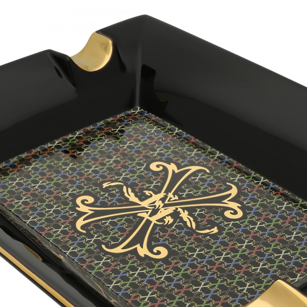 Treat yourself to an exceptional accessory with the S.T. Dupont Fuente Noir cigar ashtray from the Arturo Fuente collection. Made from high-quality porcelain, this ashtray captivates with its sophisticated aesthetic: a deep black base enhanced by multicolored motifs and gold details. Its rectangular format is equipped with two golden cigar rests, ensuring practical and elegant use. The emblematic central gold decoration creates a luxurious look, ideal for enhancing every moment of conviviality. Weighing just 610 grams, it guarantees stability and sturdiness, while remaining a distinguished decorative object, perfect for integrating into a classic or contemporary interior. Delivered in a matching original S.T. Dupont box, this ashtray is a privileged choice for lovers of fine objects. It harmoniously blends functionality and style, for a refined experience around tasting.