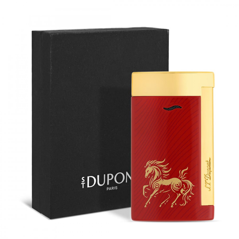 Discover the S.T. Dupont Slim 7 Cheval Rouge et doré lighter, an elegant creation that pays tribute to the year of the horse. Its ultra-thin design, just 7 mm thick, makes it comfortable to hold and intuitive to use every day. The combination of deep red and gold details enhances the horse motif, a symbol of dynamism and prestige, for a light yet robust accessory. Its torch flame guarantees efficiency and practicality with every use, while the manufacturing quality of S.T. Dupont is expressed in every detail. This lighter is delivered empty of gas, in compliance with current legislation, and presented in a branded black box, ideal for gifting or protecting your accessory.