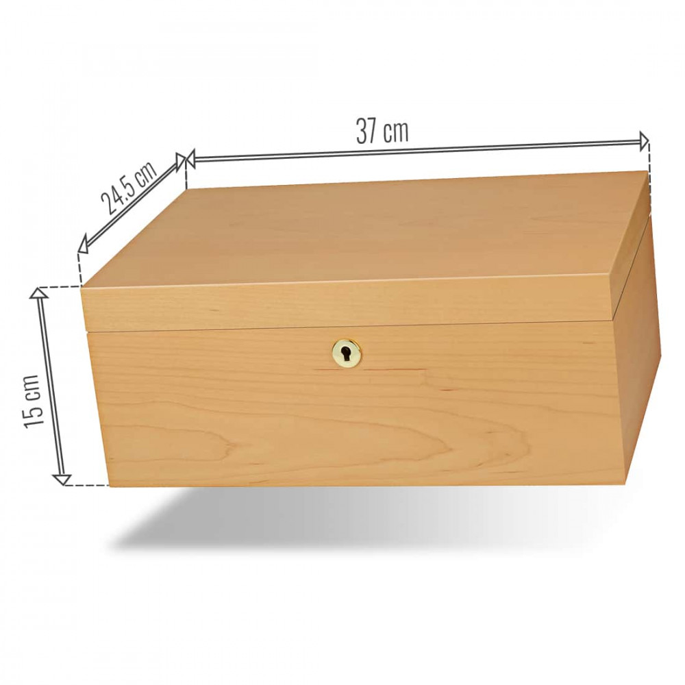 The Adorini Grande Deluxe humidor in European maple boasts a high-end finish and sober design. Thanks to its cedar interior and modular trays, it allows you to organize your collection to suit your personal taste. The precise humidifier, integrated hygrometer and magnetic accessory panel guarantee reliable humidity control. The key-operated lock and gold-plated hinges ensure optimum protection. Supplied with all accessories, this cellar is aimed at enthusiasts looking for aesthetic, reliable and spacious storage.