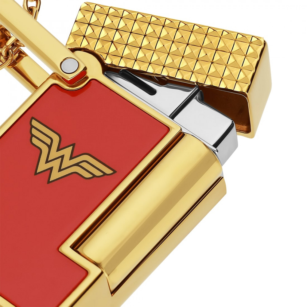 The S.T. Dupont Wonder Woman lighter necklace embodies the encounter between the refinement of S.T. Dupont and the iconic strength of the DC Comics heroine. Conceived as a collector's item, this singular jewel revisits the famous Ligne 1 lighter in the form of a boldly designed pendant. Its gold finish illuminates the silhouette, while the bright red of the central panel, adorned with the Wonder Woman logo, confers a strong, instantly recognizable identity. The metal chain adds a contemporary, precious touch, making this necklace an accessory that can be worn as a centerpiece or discreet accent. Presented in a branded black box, it will appeal to anyone looking for a unique object, combining creativity, history and savoir-faire. Perfect for pop culture enthusiasts and lovers of jewelry with an assertive character, this necklace fits easily into any premium accessory collection.