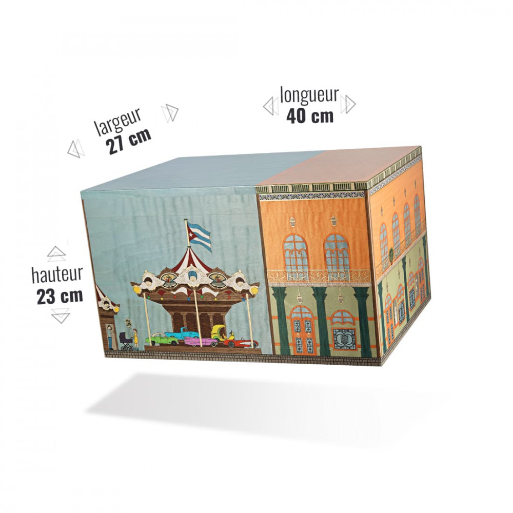 El humidor Elie Bleu Carrousel Casa Cubana le conquistará por su excepcional diseño y su generosa capacidad. Producido en una edición limitada de 288 ejemplares, esta pieza rara lleva el número 163 y encarna la excepcional maestría de Elie Bleu. Su refinada decoración de inspiración habanera evoca el ambiente festivo de antaño, con sus fachadas coloniales y su carrusel rodeado de coches de época y edificios de colores. Su intrincada marquetería de 12 tipos de madera hace de cada una de ellas una verdadera obra de arte. En su interior, la madera de cedro y los compartimentos cuidadosamente diseñados garantizan una conservación óptima de hasta 125 puros, con dos humidificadores y un higrómetro de aguja para controlar la humedad. Un objeto excepcional que combina tradición, elegancia y funcionalidad, perfecto para los amantes de los objetos finos y los coleccionistas.