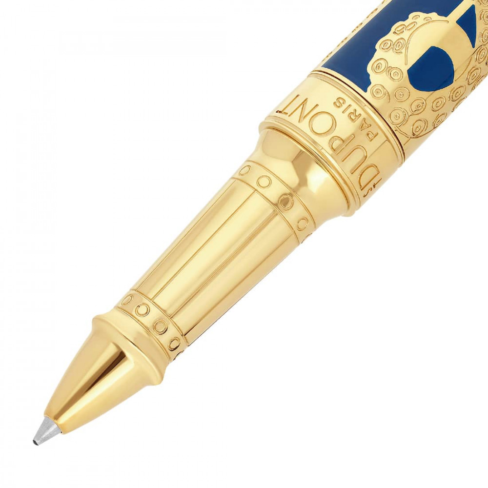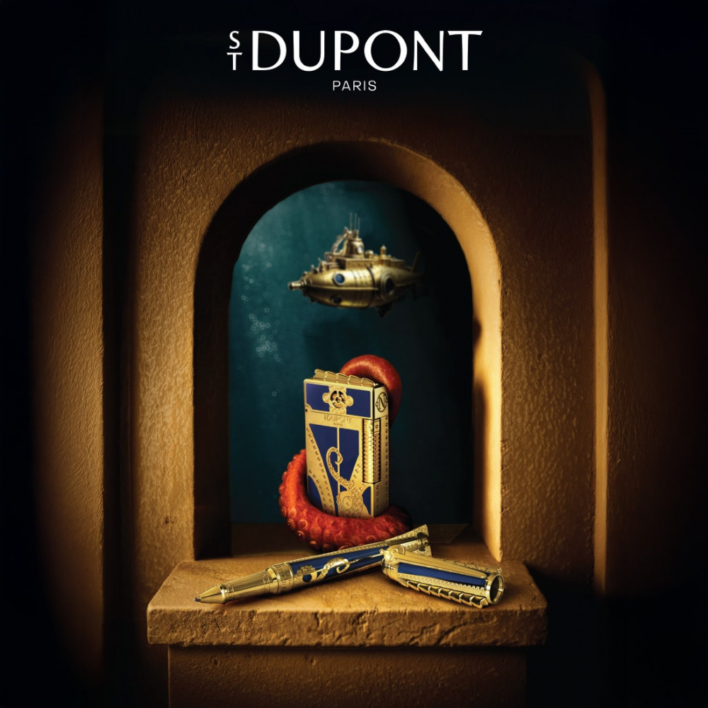 Una caja excepcional S.T. Dupont en edición limitada de 200 unidades, que incluye un encendedor Le Grand Dupont y una pluma Line D Eternity XL, inspirada en el mundo del Nautilus, en un estuche azul y dorado de coleccionista.