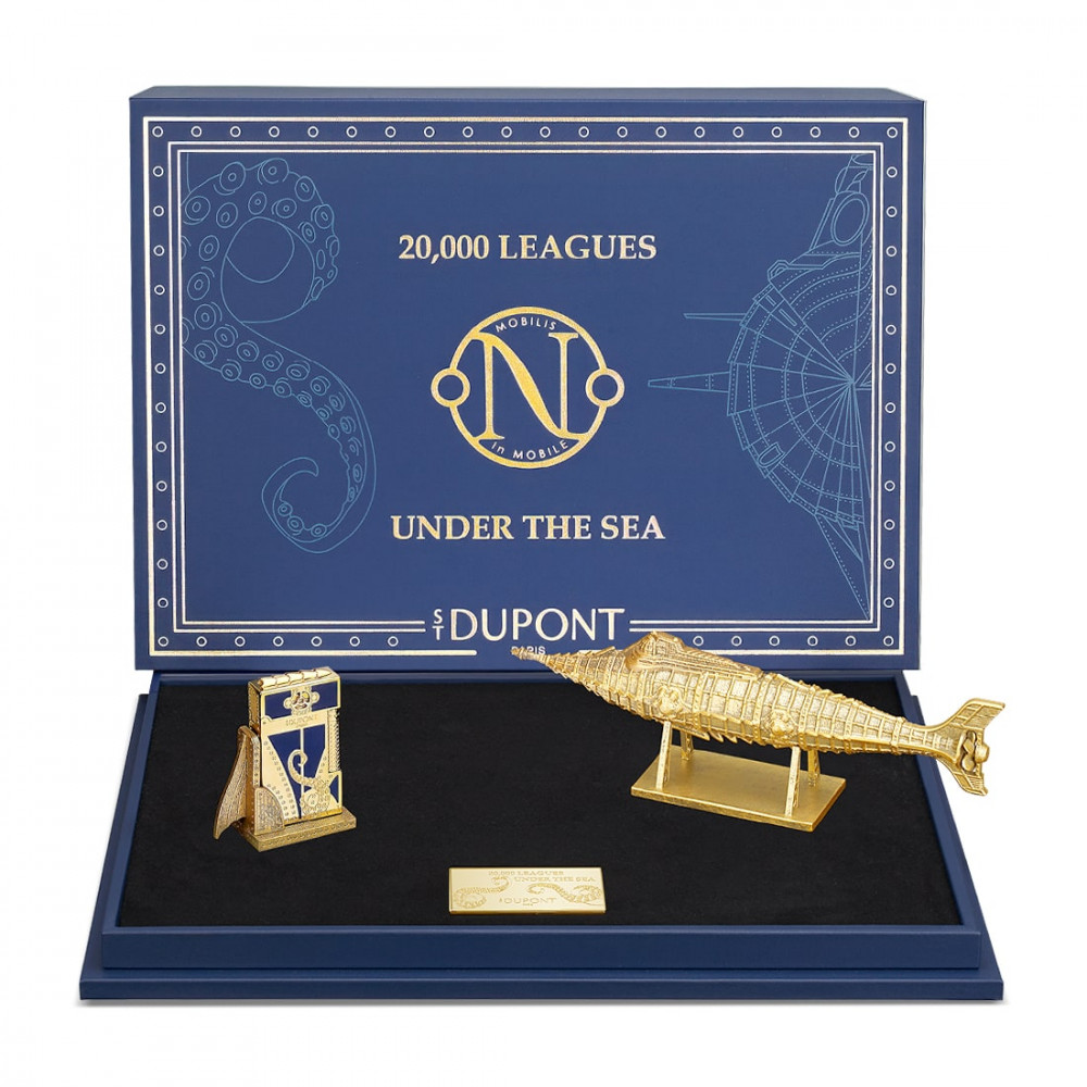 Descubra un estuche de regalo excepcional de S.T. Dupont, inspirado en el universo de Julio Verne, en una edición limitada de 180 unidades, que incluye un encendedor Ligne 2 en laca azul y oro, entregado en una caja de coleccionista con una escultura del Nautilus.