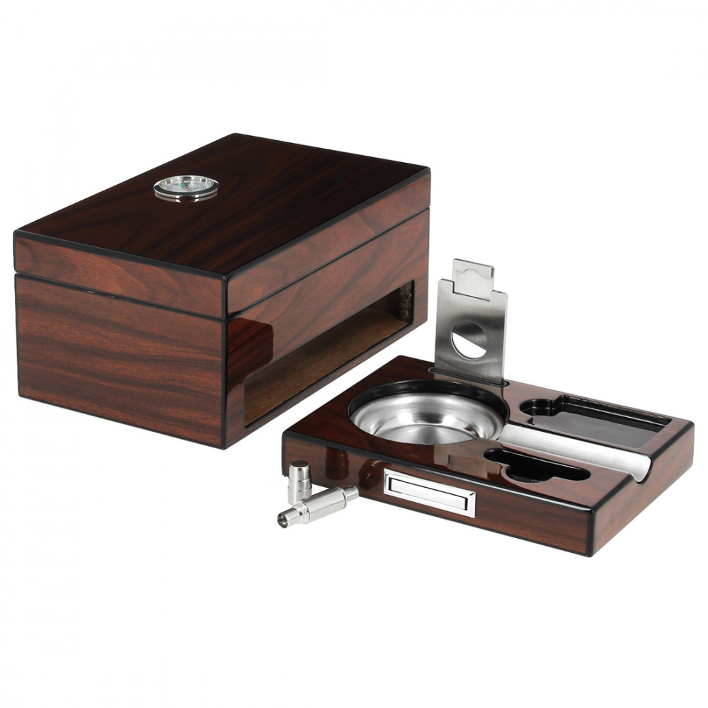 Son extérieur en bois de teinte foncée s'harmonisera sans problème à votre intérieur. Dotée de différents accessoires, cette cave à cigare permet un usage des plus raffinés. Coupe-cigare guillotine, cendrier et repose-cigare, emporte-pièce 7mm et hygromètre à aiguilles n'en sont que quelques exemples.