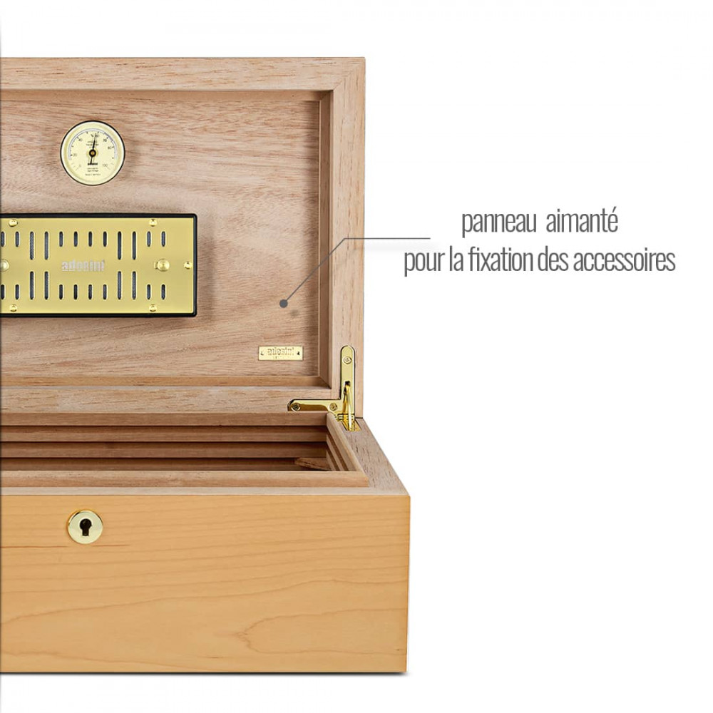 Cette cave à cigares en érable d’Europe signée Adorini associe élégance, sécurité et fonctionnalité pour préserver vos cigares. Équipée d’un humidificateur, d’un hygromètre intégré et de compartiments modulables, elle allie design raffiné et grande capacité de stockage.