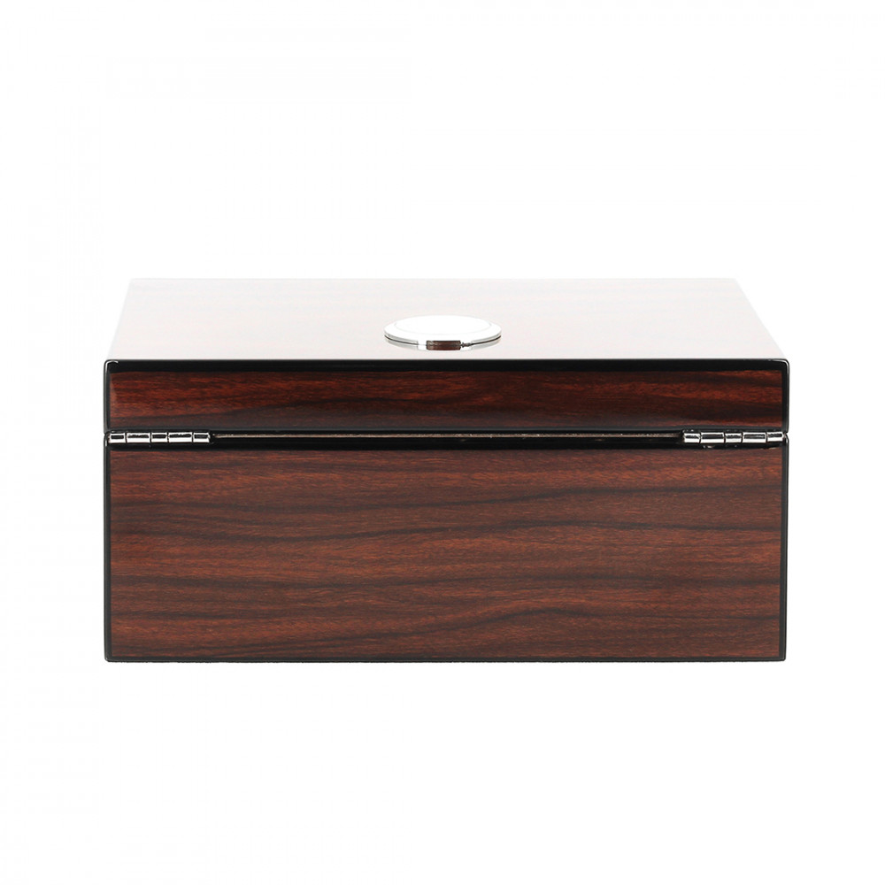 Imagine-o na mesa do café ou, senhor, na sua secretária! Esta caixa de charutos, com o seu design sóbrio e linhas limpas, não é apenas um belo objecto decorativo, mas também um acessório útil para todos os amantes de charutos. O seu exterior de madeira escura irá facilmente combinar com o seu interior. Equipado com vários acessórios, este armário de charutos permite o uso mais refinado. O cortador de charutos guilhotina, cinzeiro e descanso para charutos, cortador de charutos de 7mm e higrómetro de agulha são apenas alguns exemplos. A Churchills, os Lonsdales e os Grand Panetellas encontraram o seu lar&