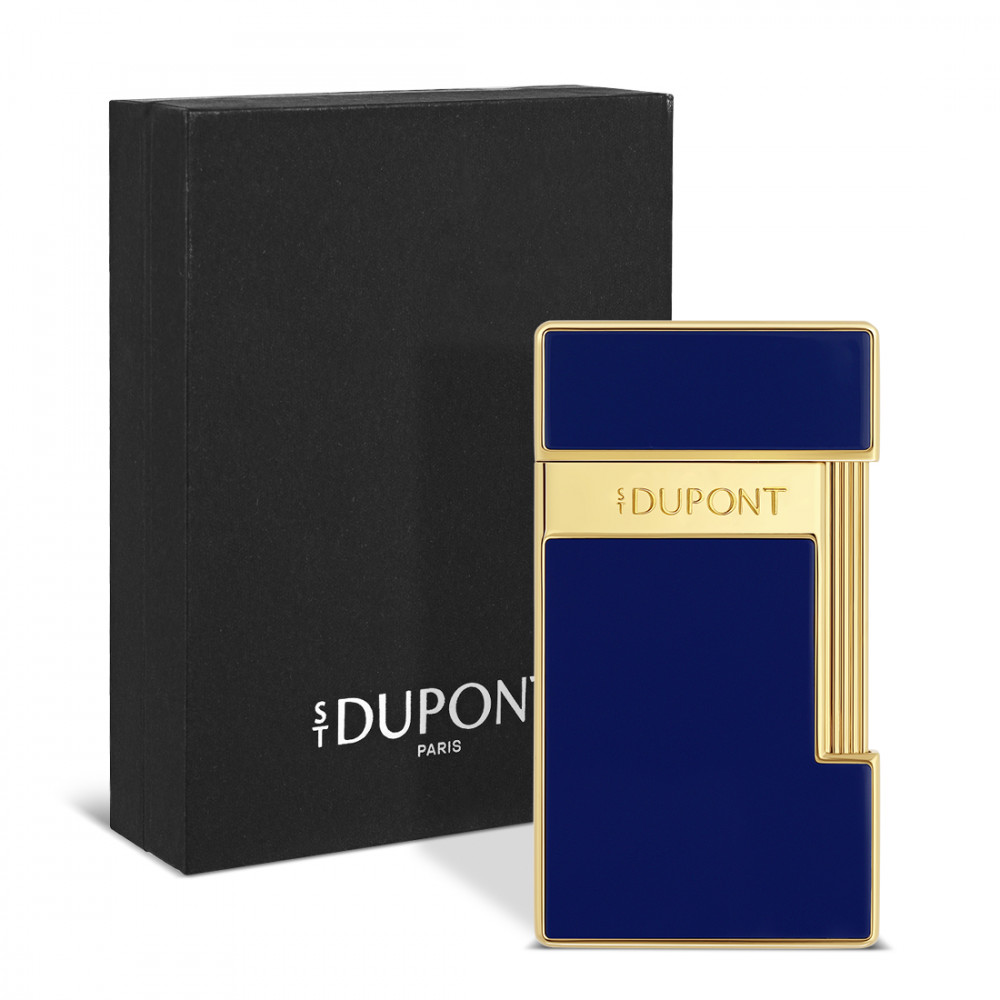 Com o seu acabamento em laca azul e detalhes dourados, o isqueiro S.T. Dupont Slimmy combina subtilmente elegância e eficiência.