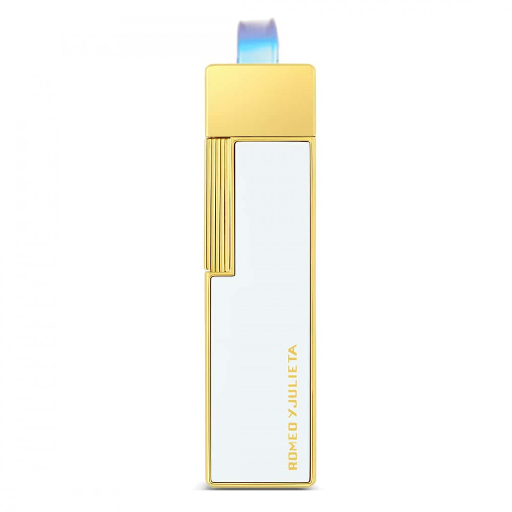 Inspirado na famosa coleção Twiggy, este isqueiro S.T. Dupont Romeo y Julieta White and Gold tem um aspeto fino e elegante. O seu acabamento em laca branca, realçado por detalhes dourados e um motivo vintage Romeo y Julieta, dá-lhe um toque sofisticado. Este modelo combina praticidade e estética graças à ignição eletrónica da chama da tocha, garantindo uma utilização diária fiável. Concebido para aqueles que apreciam a qualidade do fabrico francês, é apresentado numa caixa preta que assinala a colaboração entre S.T. Dupont e Romeo y Julieta. Uma peça de coleção funcional e luxuosa, vendida vazia de gás, de acordo com os regulamentos.