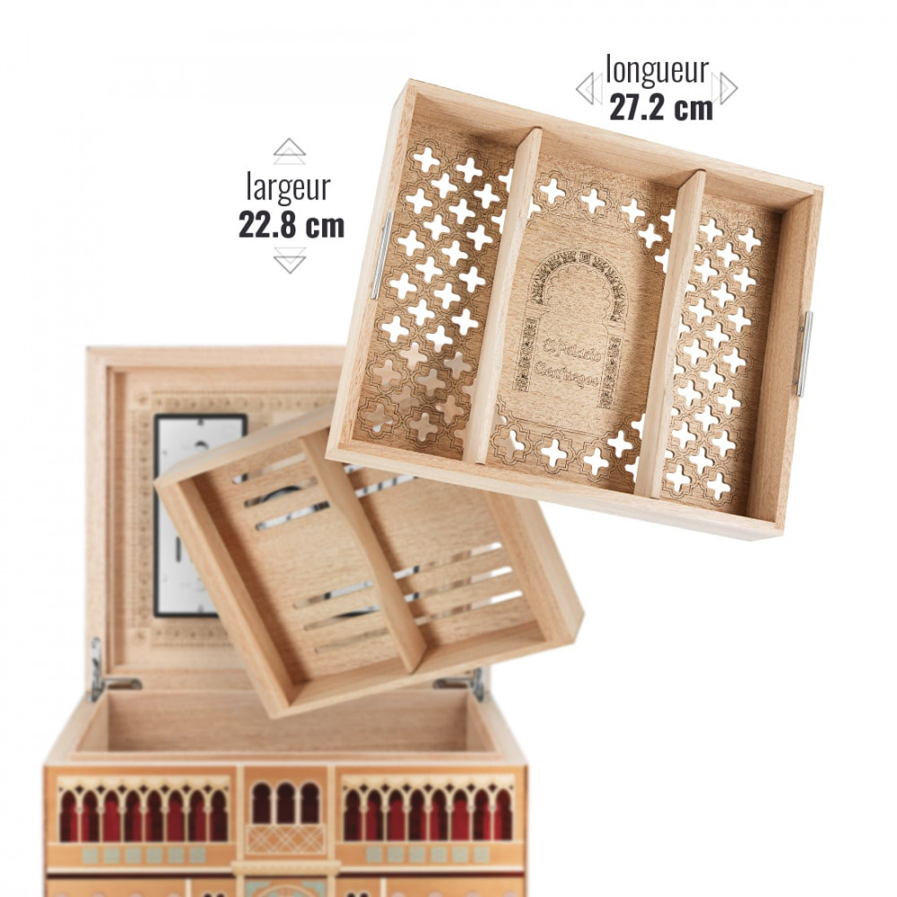 Dimensões: Este humidor mede 32 cm de comprimento, 27 cm de largura e 23,5 cm de altura.
