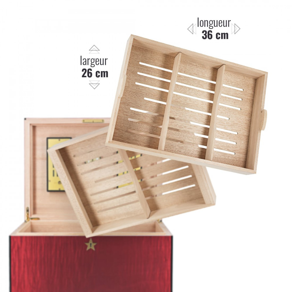 Dimensões: este humidor mede 40 cm de comprimento, 30 cm de largura e 20,5 cm de altura. Os tabuleiros interiores medem 36 x 26 x 5 cm.